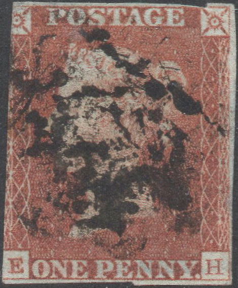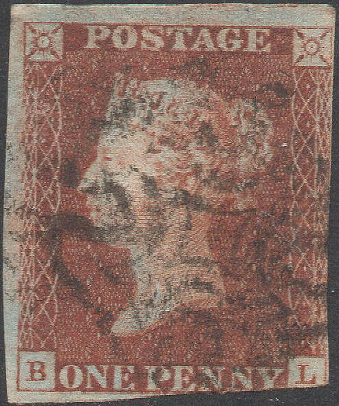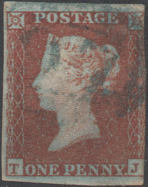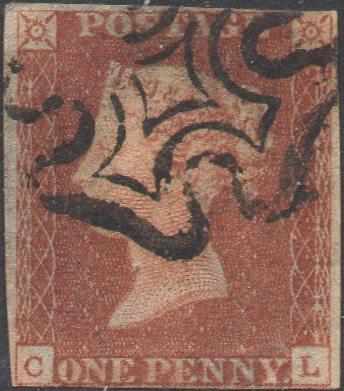 1840 1d Intense Black: A FU single in an INTENSE BLACK shade, with four close(SW)-to-mostly good even margins, messily cancelled with a red Maltese Cross. Slight BASAL SHIFT, NE corner frame-line extending N, and 'I' misplaced left. Cat.£525+. | £90.00 |