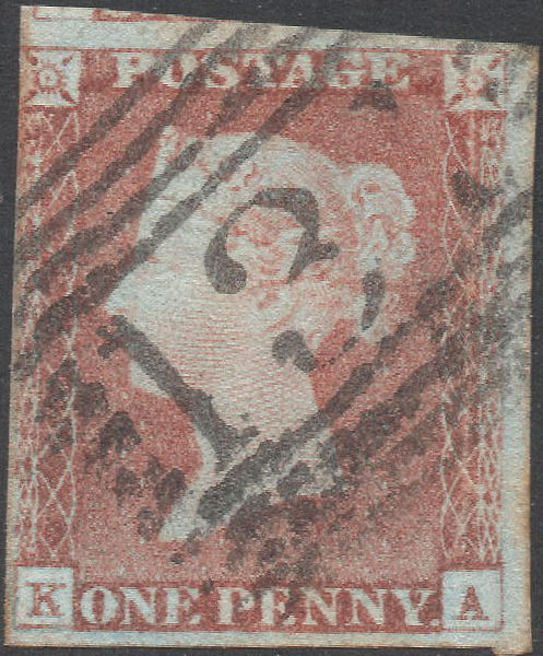 1841 1d Red-brown A GU+ single from this SCARCE plate, with 3.75 good-to-HUGE margins, but touched/trimmed at SW corner, cancelled with a black Maltese Cross. NW 7 o'clock Ray Flaw, and 'C' misplaced left. Cat.£325. | £35.00 | ![]() |
