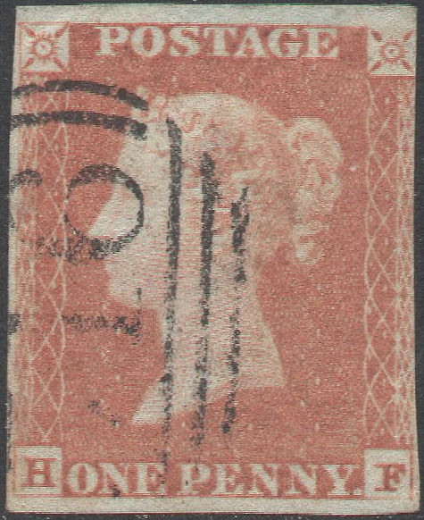 1857 1d Rose-red C11 (SG36): A FU+ single, WELL-CENTRED for these, with FULL PERFS, but slight surface scuff SE, lightly cancelled with a neat London 'NW 12' duplex. Lower E frame-break, NE 1 o'clock Ray Flaw, and 'P' with small loop misplaced left. Cat.£80. | £15.00 |