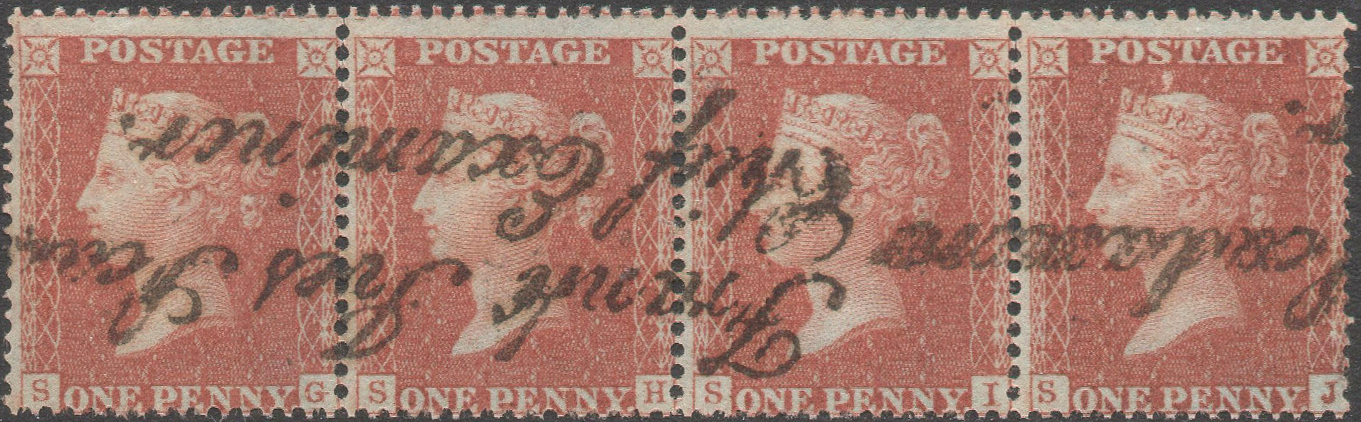 A GU+ single from this VERY SCARCE plate, off-centre low, toned, and with horizontal crease, but with FULL PERFS, cancelled with a Brighton '132' SIDEWAYS DUPLEX. Blurs outside NW, NE 1 o'clock Ray Flaw, and short 'H' tilted W. | £35.00 |