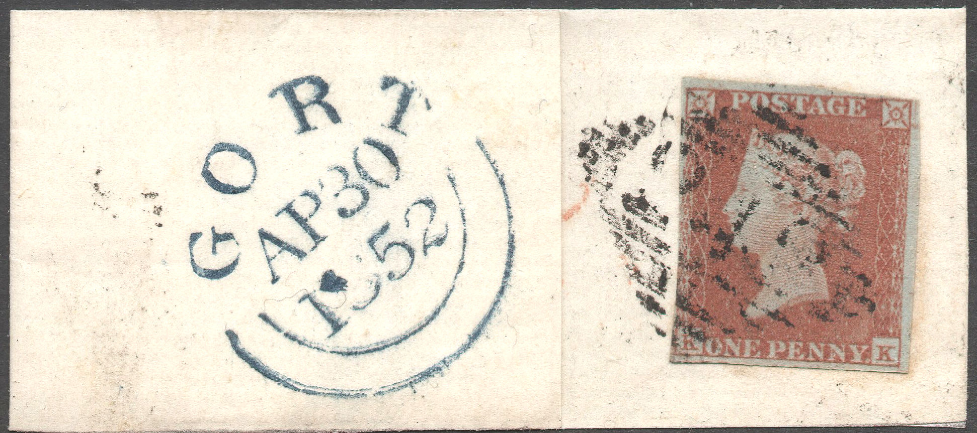 A FU single in a lightish Red-Brown shade, showing some plate wear, with four close(W)-to-LARGE margins, on neat small folded over piece, cancelled with an IRISH GORT '242' numeral, with the GORT CDS of 30 APRIL 1852 on the folded over obverse. A MISSING IMPRIMATUR, showing letters misplaced low left and low. Cat.£38+. | £8.50 |