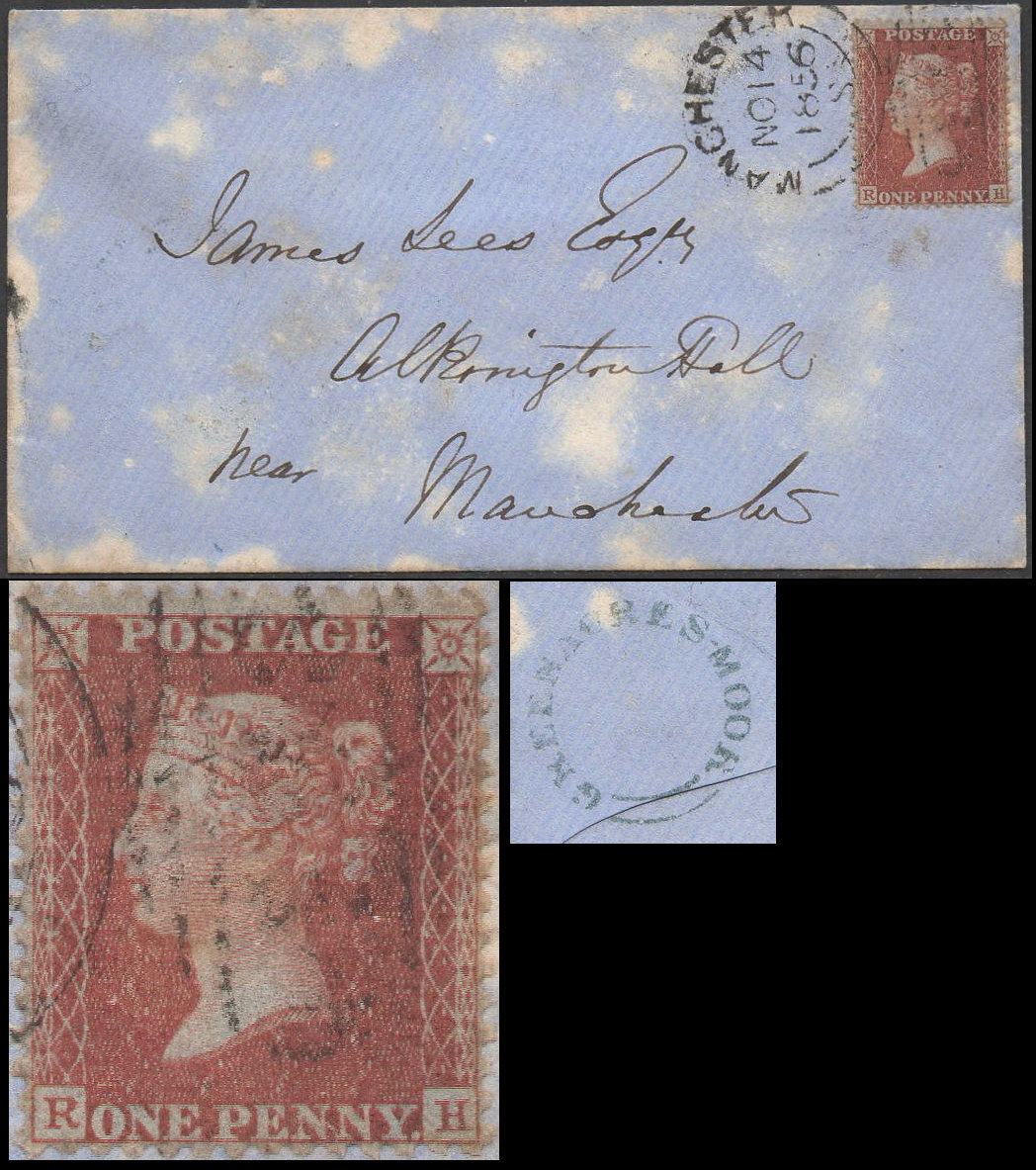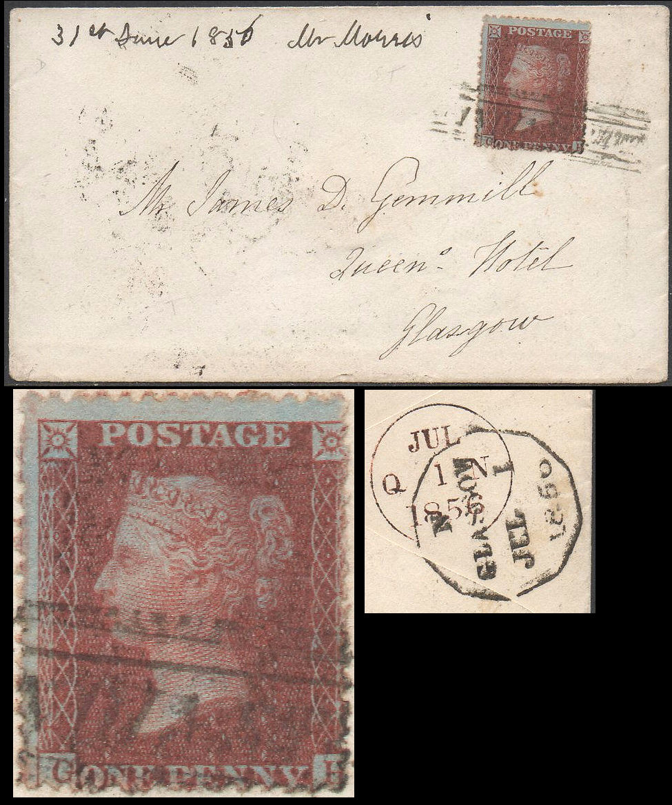 1854 1d Red-brown, a FU+ single, off-centre low right, but with FULL PERFS, on a clean empty envelope Chester to London on 23 August 1855, cancelled with two CHESTER SPOONS. 'Q' misplaced low left. Cat.£60++. | £25.00 | |