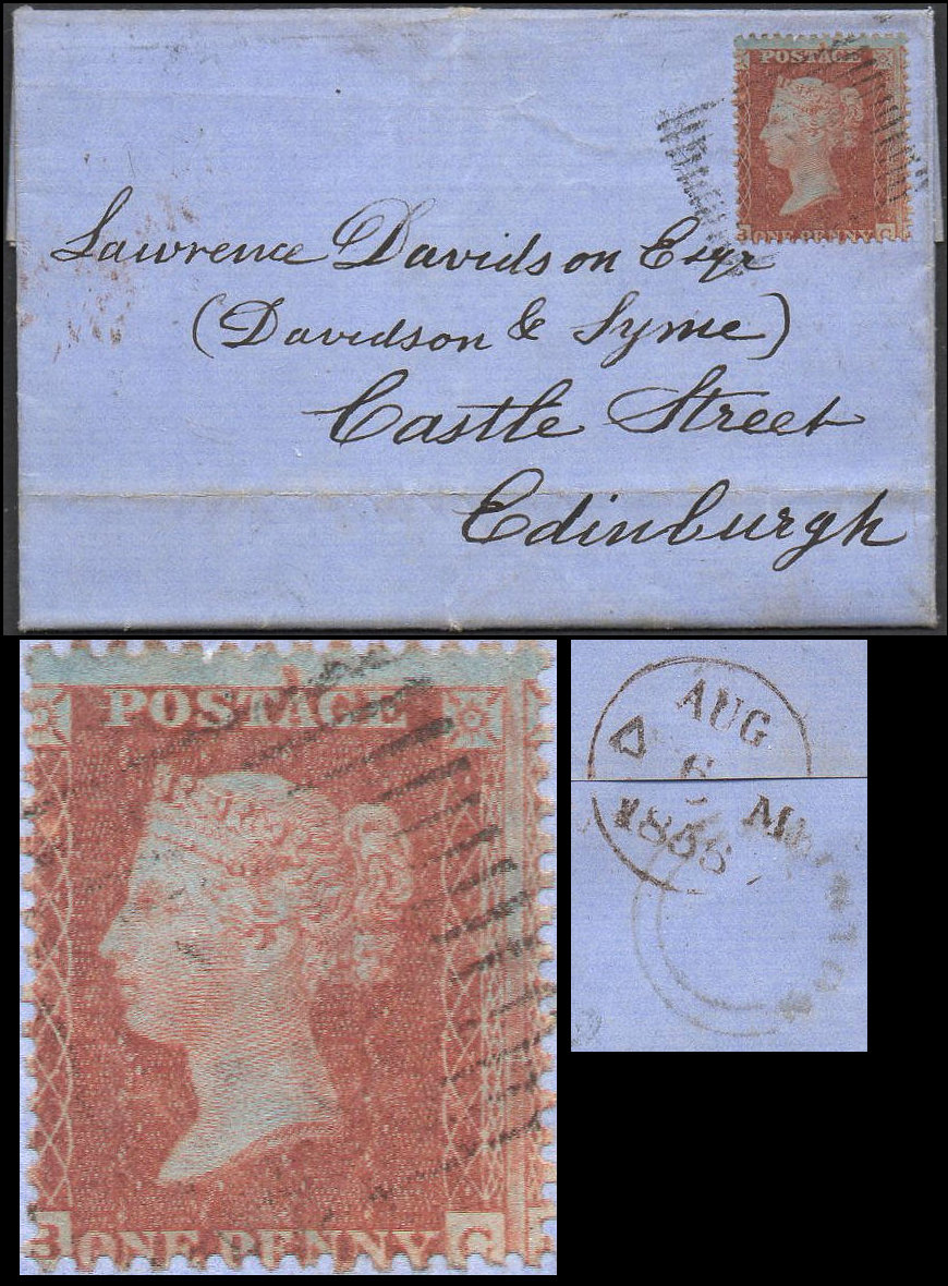 1857 1d Rose-red, a FU+ single from this slightly SCARCER plate, off-centre low left and slightly oxidised, but with FULL PERFS, on clean empty envelope Edinburgh to London on 16 October 1860, cancelled with an Edinburgh '131' duplex. Lower E frame-break, NE 1 o'clock Ray Flaw, and blurs E and in SE. Cat.£20+ (for cheapest plate off-cover). | £4.50 |