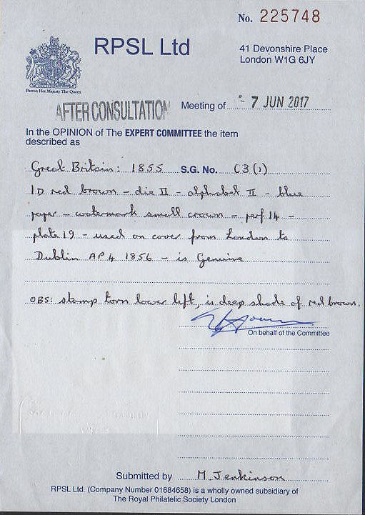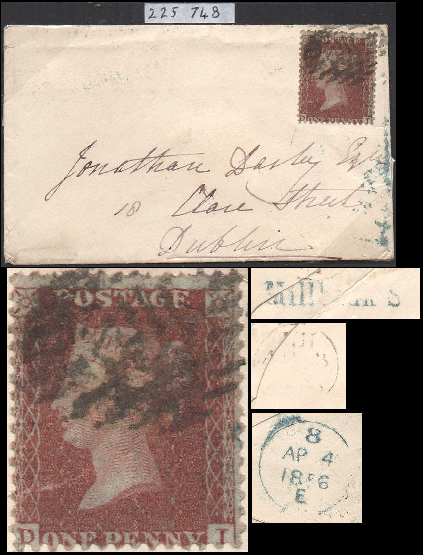 1854 1d Red-brown, a FU+ single, off-centre high left, but with FULL PERFS, on empty envelope Dublin to Warrington on 17 March 1855, cancelled with a DUBLIN '186' numeral. Letters misplaced right and low respectively. Cat.£60+. | £13.50 | |