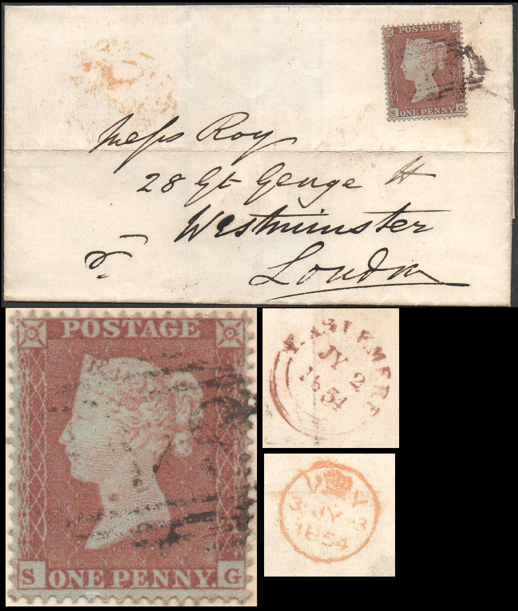 1854 1d Red-brown, A SUPERB USED single from this SCARCER plate, WELL-CENTRED, with FULL PERFS, on a clean EMPTY WRAPPER from Haslemere (Surrey) to London on 2 July 1854, lightly cancelled centre right and tied with a large part slightly smudged inverted SCARCE HASLEMERE '341' numeral (Parmenter RARITY 'F' -'RARE'), leaving virtually COMPLETE CLEAR HEAD. A MISSING IMPRIMATUR, showing letters misplaced low left and low right. Cat.£60++ (for cheapest plate on cover). | £30.00 |