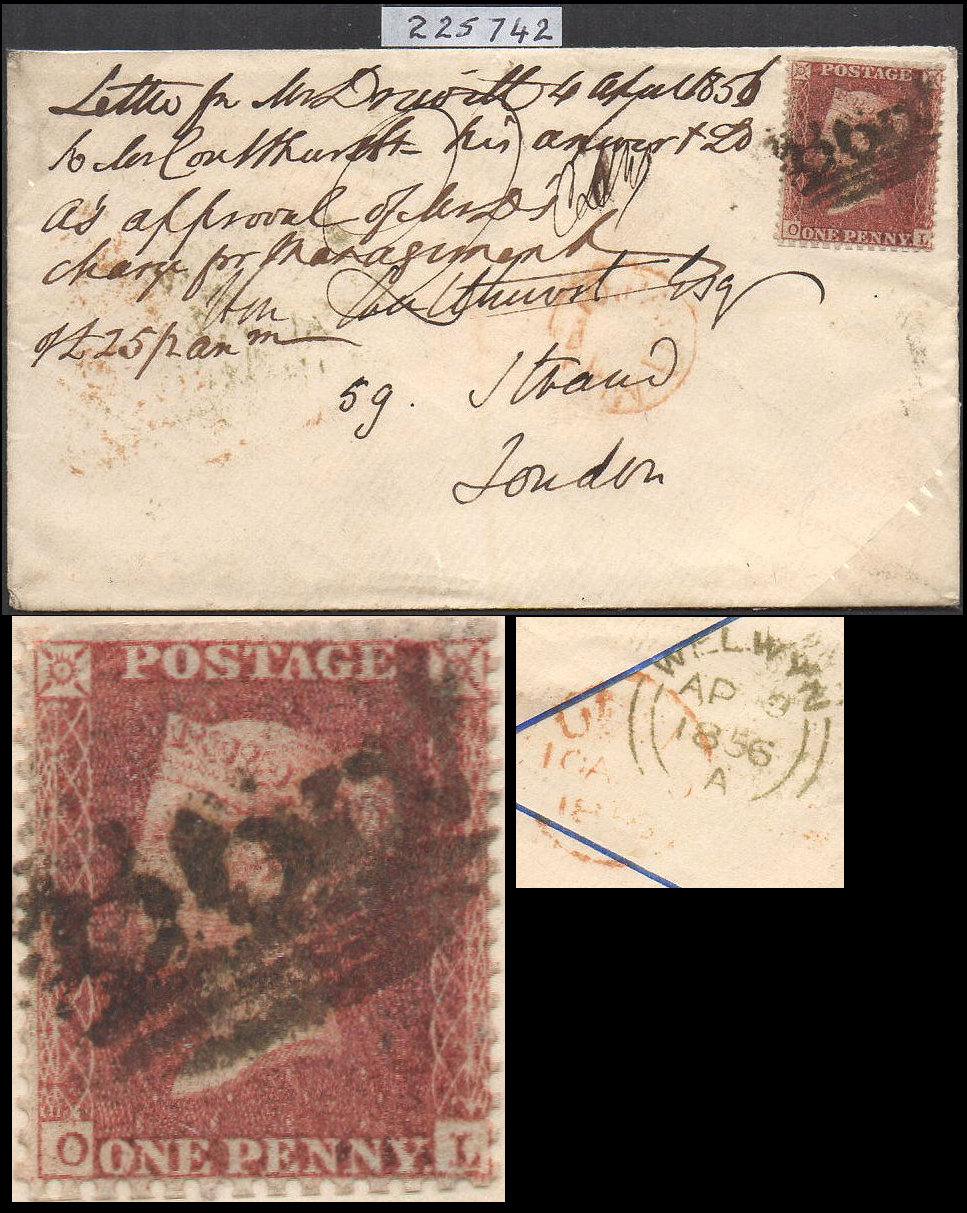 1855 1d Red-brown, a FU single from this VERY SCARCE plate in the SCARCE Small Crown, Perf.14 issue, UNUSUALLY WELL-CENTRED for these, with FULL PERFS, on entire Cullompton to London on 23 February 1855, an EARLY USE, rather heavily cancelled with a Cullompton '214' numeral. Lower E recut, and letters misplaced low right. Cat.£300++ (SG price for OFF-COVER). | £125.00 | |
