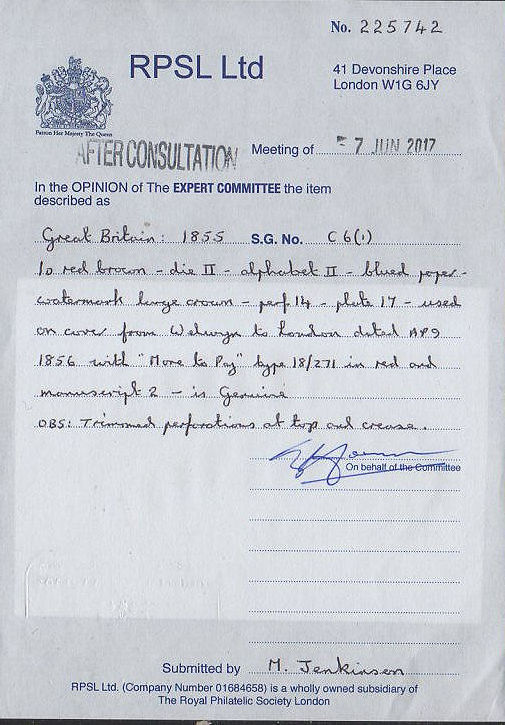 1854 1d Red-brown, a VFU single, centred slightly high left, with FULL PERFS, on a grubby empty wrapper London to Ludlow on 29 December 1854, cancelled low right with a London Inland '18' numeral, leaving COMPLETE CLEAR HEAD. A MISSING IMPRIMATUR, showing CONSTANT VARIETIES: blur over 'T', and mark NE (doubled SW long ray - minor Re-entry?). Cat.£60+. | £17.50 | |
