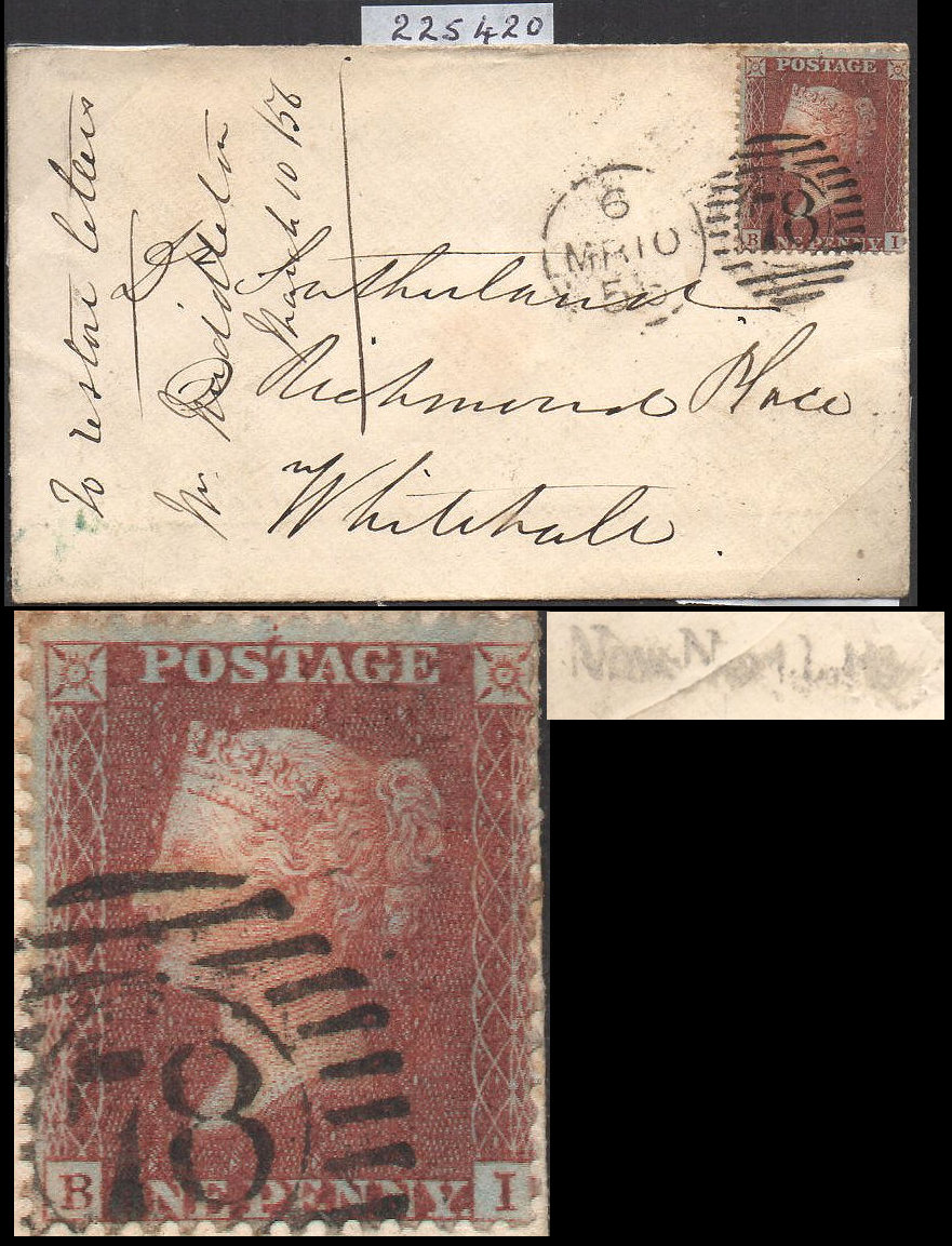1857 1d Rose-red, a VFU single, WELL-CENTRED, with FULL PERFS, on clean empty wrapper Leeds to London on 4 March 1858, cancelled with a Leeds '447' duplex. Lower E frame-break, NE 1 o'clock Ray Flaw, blur outside NW, and W 'H' misplaced right and tilted E. Cat.£20. | £5.00 |