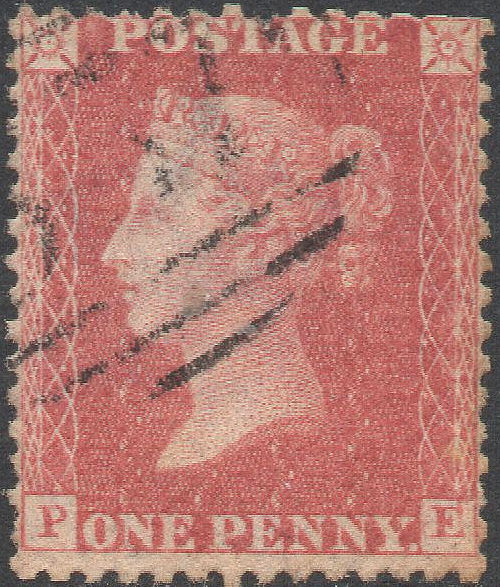 A FU single from this SCARCE plate, in a late Savoy Street ROSE shade, centred a whisker high, and with one or two minor perf faults, VERY LIGHTLY cancelled with an English Provincial numeral. CONSTANT VARIETY: scratch SW; also 'E' misplaced high, and both letters tilted W. Cat.£100+. | £18.50 |