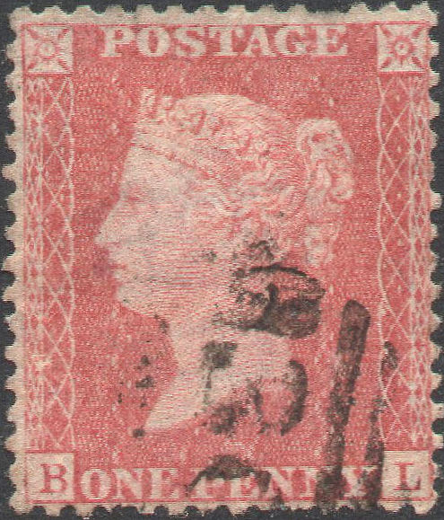 A VFU single from this VERY SCARCE plate, in a PRE-FIRE PALE RED shade (this plate not at press at Savoy Street), centred a whisker low, with FULL PERFS, lightly cancelled with a Cheltenham '177' SIDEWAYS DUPLEX. 'L' misplaced low. Cat.£300. | £75.00 |