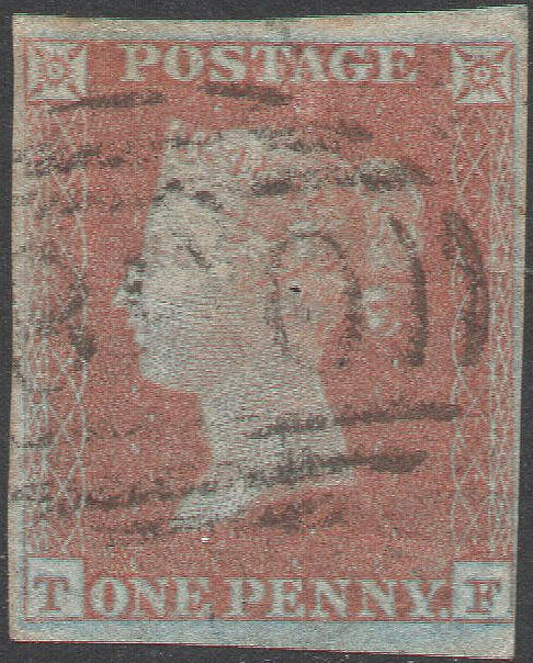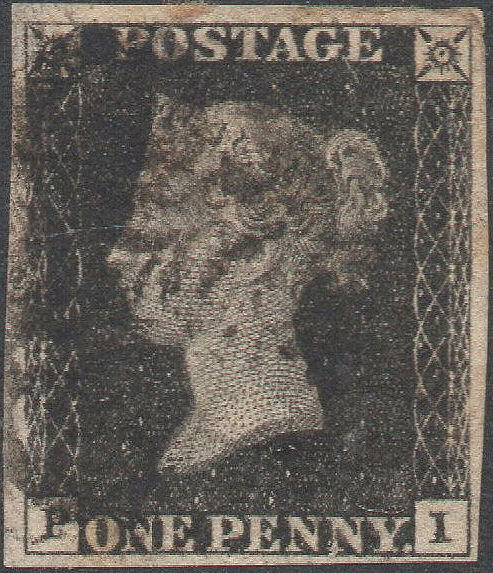 1840 1d Intense Black: A FU single in an INTENSE BLACK shade, with four close(SW)-to-mostly good even margins, messily cancelled with a red Maltese Cross. Slight BASAL SHIFT, NE corner frame-line extending N, and 'I' misplaced left. Cat.£525+. | £90.00 |