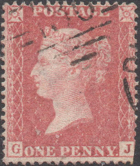 1857 1d Rose-red C11 (SG36): A GU+ single from this SCARCER plate, centred a whisker low, with FULL PERFS, but small thin, lightly cancelled with a London District '75' duplex. Letters misplaced left and right. Cat.£100. | £10.00 |