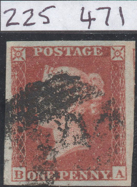 A VFU single from this slightly SCARCER plate, with four good-to-LARGE even margins, cancelled with a Bury '154' numeral. SW and SE corner frame-lines extending S, and letters misplaced low to centre. Cat.£45. | £11.50 | ![]() |