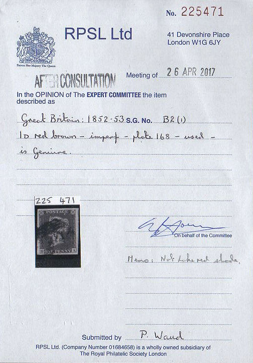 A VFU+ single, in an UNUSUAL DEEPISH VERY RED shade closely approaching the SCARCE LAKE-RED shade (in my opinion), on VERY BLUE paper, with four LARGE-to-HUGE margins, cancelled with a smudged English Provincial numeral. A PULLED PRINT NW, NE corner frame-line extending E (slight), and letters misplaced low left and low right. Cat.£40+. NOTE: The stamp was submitted to the RPSL for clarification as to shade, with the pencilled Memo as seen. |