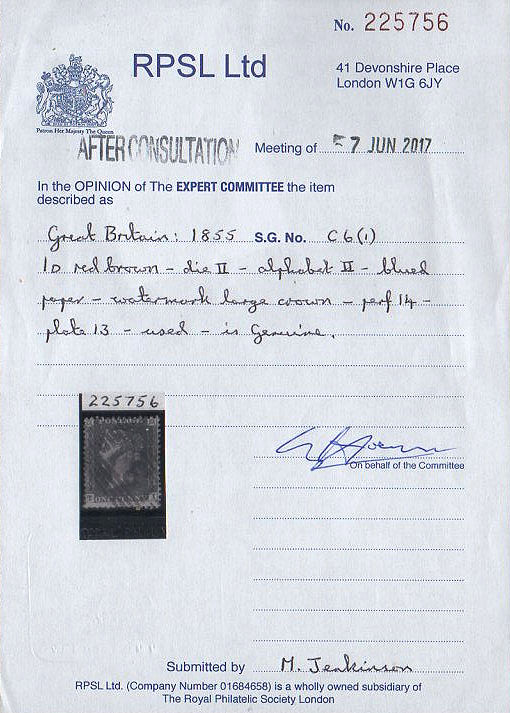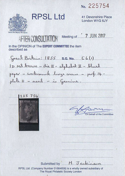 A VFU single from this SCARCER plate, in a FINE UNLISTED DEEP RED-BROWN shade, centred slightly right, with FULL PERFS, cancelled with a London Inland '6' numeral. Letters misplaced high right and low right. RPS CERTIFICATE as 'Red-brown C6(1), but I consider this deep shade occurs sufficiently frequently (particularly on later Alphabet II plates) to be worthy of listing in its own right (see notes above). Cat.£80+. | ![]() £20.00 |