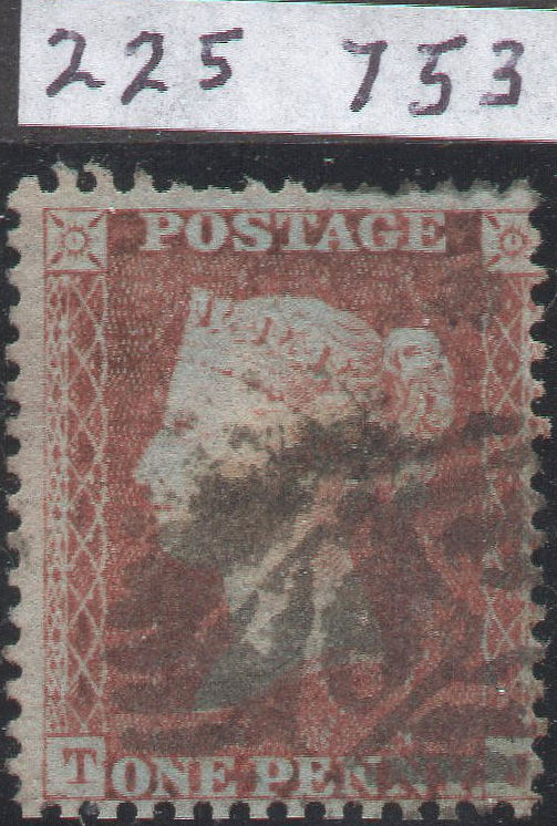 A VFU single from this SCARCER plate, unusually WELL-CENTRED for this plate, with FULL PERFS, lightly cancelled with a Coventry '223' numeral. A MISSING IMPRIMATUR, with E margin narrow, SE corner frame-line extending E, and letters misplaced right and low right. Note: the blur on the neck is non-constant, probably as a result of an accidental ink spill. Cat.£150. | £37.50 | ![]() |