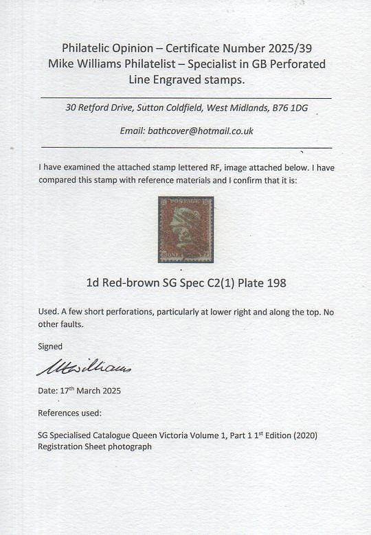 1855 1d Red-brown, Plated by Paul Witham, a FU+ single from this SCARCER plate, centred rather low left, but with FULL PERFS, lightly cancelled with a Tavistock '780' numeral. Letters misplaced low left and left. Cat.£150. | £35.00 | |