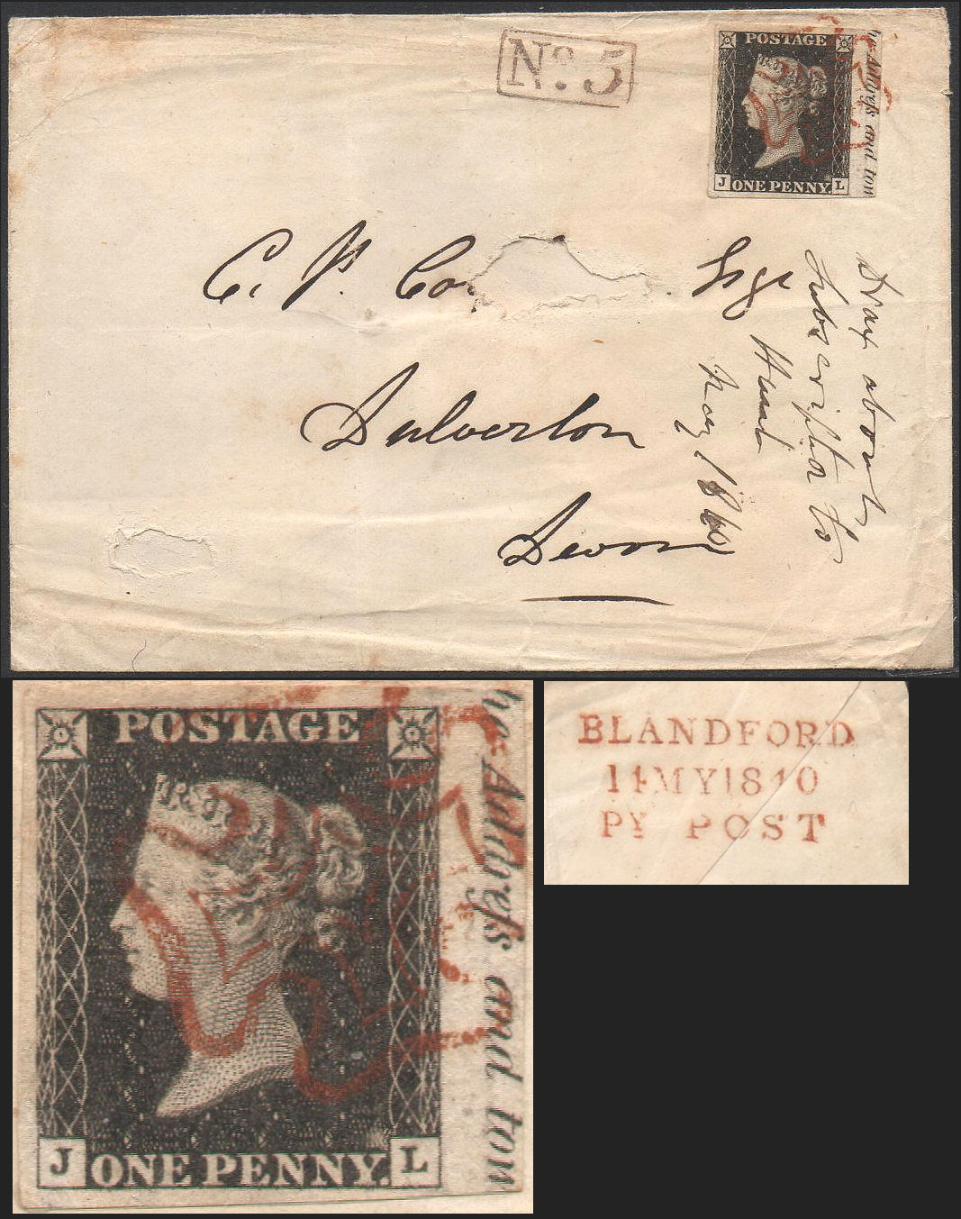 1840 1d Intense Black: A SUPERB USED MARGINAL single in an INTENSE BLACK shade (a VERY EARLY print, but even so with a tiny spot of wear just above the 'L' square), with four LARGE-to-VAST margins, with MARGINAL INSCRIPTION '...the Address and tow...', on a clean but flimsy EMPTY ENVELOPE Blandford to Dulverton on 14 MAY 1840, a Thursday, and a RARE 'MAY DATE', a mere eight days after the first issue date. It is lightly cancelled and tied with a lovely neat BROWNISH-RED Maltese Cross. A neat 'No. 5' RECEIVING HOUSE on the fromt, and a LOVELY neat DATED 'BLANDFORD PENNY POST' on the obverse complete the picture of a remarkable cover. NW 5 and 10 o'clock Ray Flaws, and 'L'misplaced high left. Despite damage to the address panel, a SUPERB EXHIBITION PIECE. | £1895.00 |